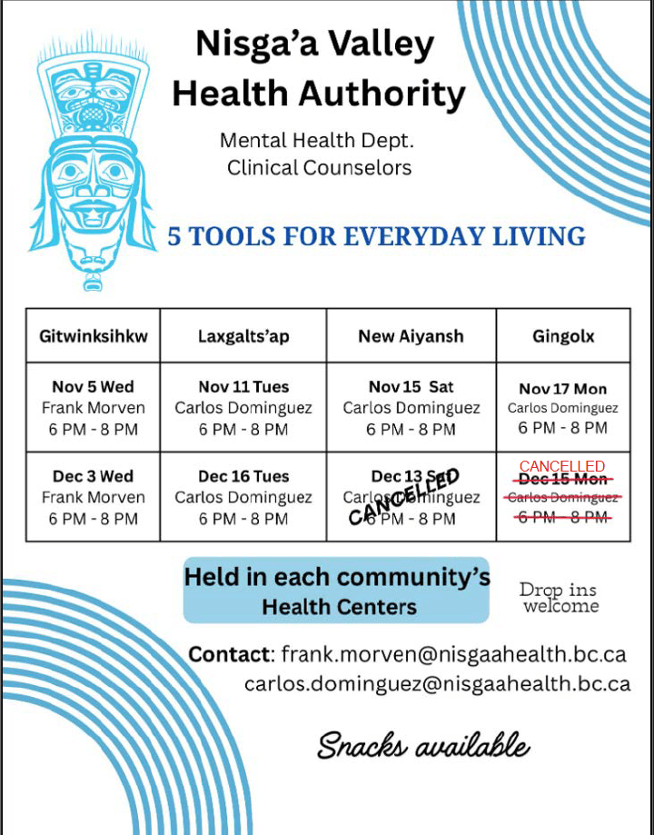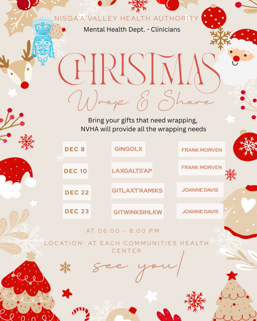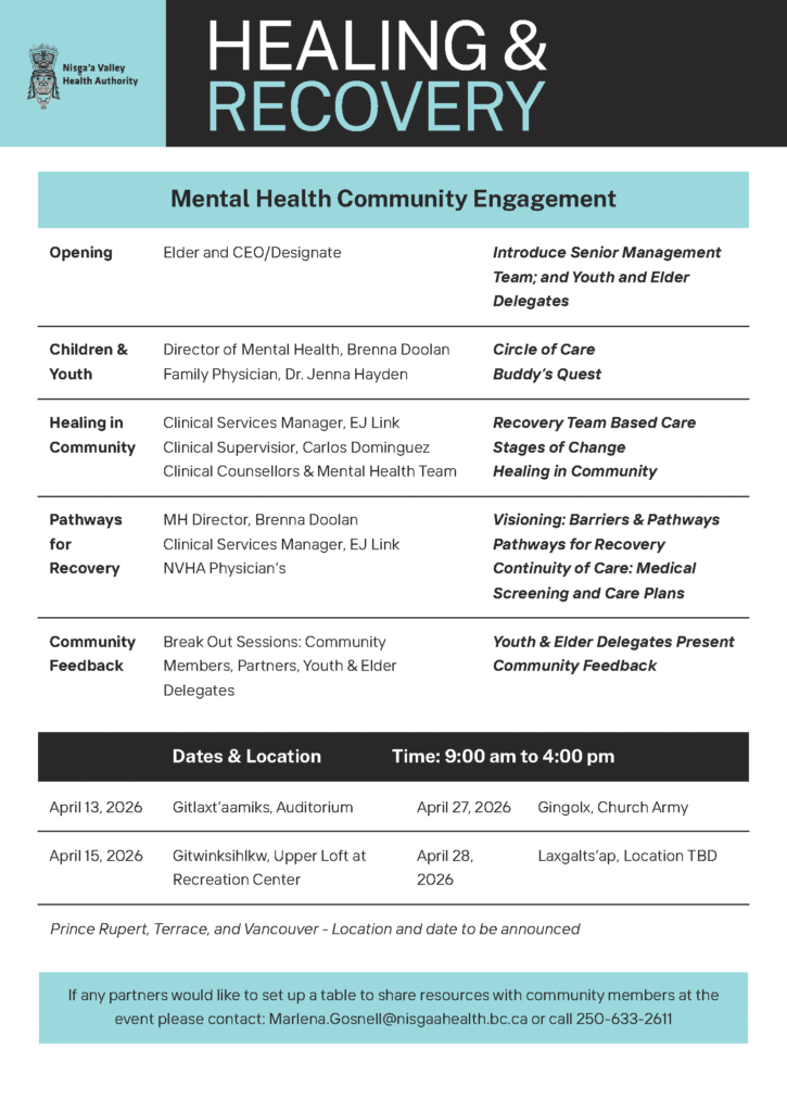 Nurturing community is very important to the Nisga’a Valley Health Authority. Learn about programs and events taking place in the community by visiting our calendar HERE. Nisga’a has many active Facebook pages where you can learn about what is going on in the community as well.