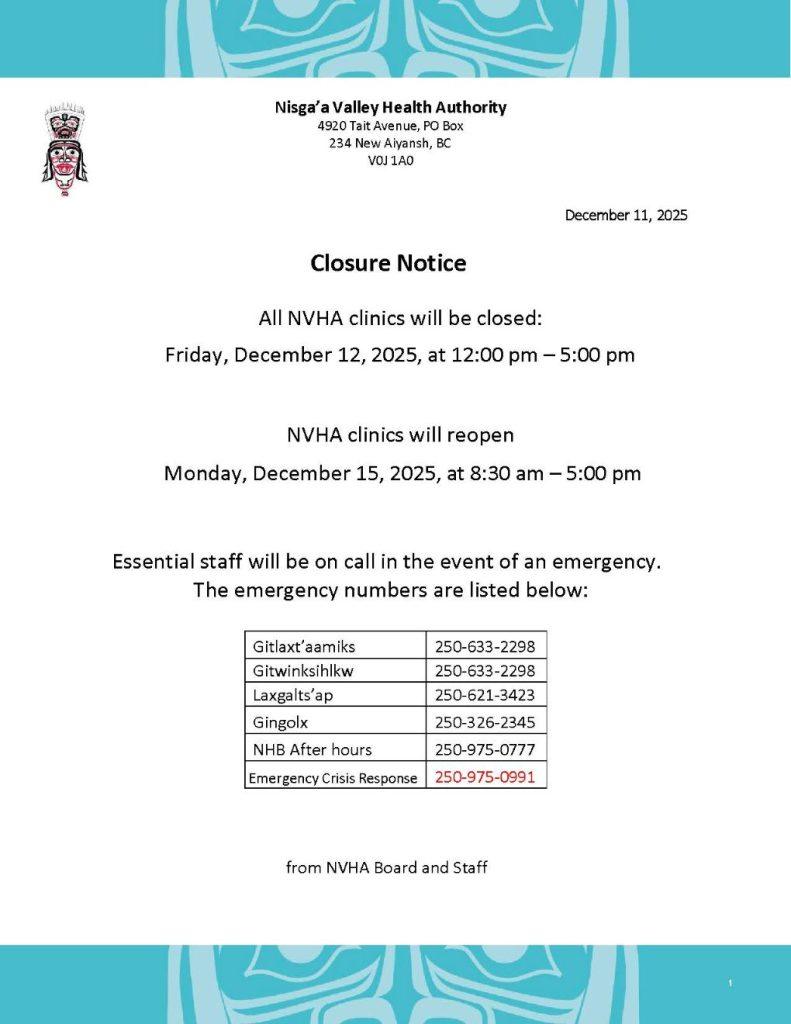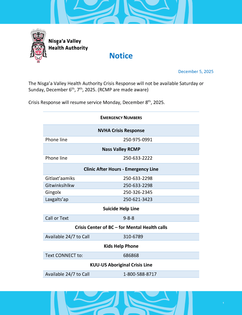 The Nisga’a Health Benefits (NHB) program provides supplemental health care coverage for Nisga’a citizens and band members based on need. This helps ensure that medical care is accessible to all Nisga’a people in an inclusive way. To see if you are eligible for Nisga’a health benefits and to find out how to access them, click HERE.